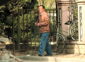 16:34 “黄夹克”骑至八里台靠近师大南院一侧的桥下,停住。他从绿色塑料兜儿中取出一把红色车锁,将银灰色自行车锁在路边的铁栅栏上,而后又骑上黑色自行车继续前行。