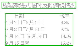 昨天,福建一家皮鞋出口企业的业务经理张先生告诉记者,目前征收的税率只有约4.8%左右,但订单交货期往往是后移的,4月在广交会接下订单,5月~7月都是交货高峰期,税率随时间不断提高绝对影响客商下订单的热情。