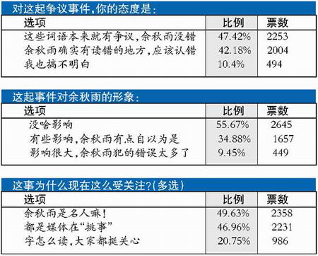 本报与新浪论坛联合发起相关调查,截至昨天下午,在不到两天的时间内,有4000多人参加了调查。调查显示,虽然在余秋雨到底有没有读错字的问题上,网友分歧非常大,但多数网友对余秋雨的言论表示宽容,支持余秋雨继续当“主考官”占到被调查人数的63.25%。