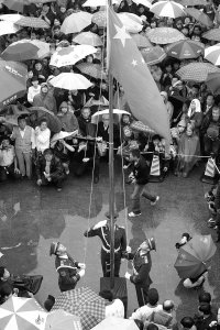 虽然下着中雨,但冰凉的雨水丝毫没有降低脑瘫孩子们观看升旗的热情,在网络义工联盟、南大和体院众多志愿者的帮助下,脑瘫孩子们早早来到鼓楼广场。打着雨伞,披着雨衣,排着整齐的队伍,孩子们在风雨中静静地期盼着五星红旗的升起。