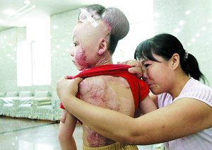 郝祥花慢慢抬起泪眼,当在女儿明亮的眸子中看到自己时,泪水又一次流了下来———眼前的女儿右半边脸颊如花似玉,白皙的皮肤,大大的眼睛,长长的睫毛,翘翘的小鼻子……而和右脸颊对应的左脸颊,却“惨不忍睹”———布满暗红色的伤疤,整个下巴完全被疤痕侵蚀。