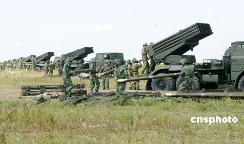 资料图片:去年中俄联合军事演习强制隔离作战时,炮兵士兵紧张装弹作发射准备。