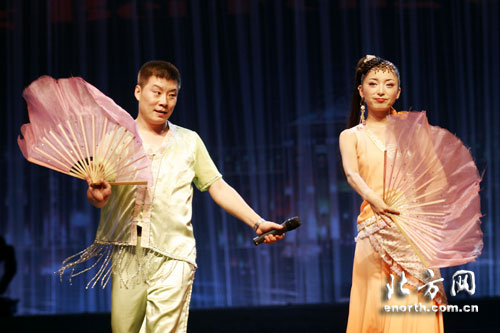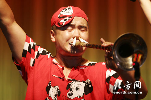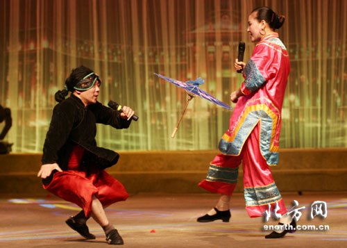 北方网消息(记者刘欣):18日晚,参加网络媒体吉林行的记者们,感受了一把东北文化,在东北风剧场观看了二人转表演。演员们诙谐的表演让来自全国各地的网络媒体记者乐开了花。