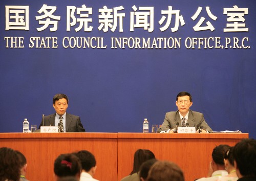 7月18日,国务院新闻办举行新闻发布会,邀请国家统计局新闻发言人郑京平(右)介绍2006年上半年中国经济增长情况,并回答记者提问。