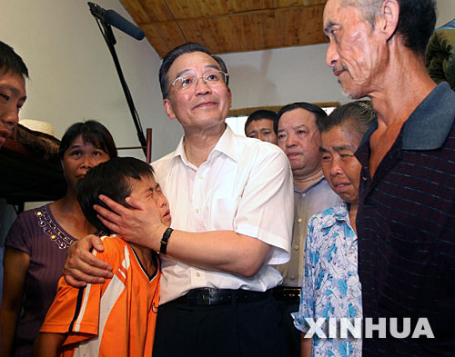 洪水无情,人有情。在抗灾过程中,涌现出了一大批可歌可泣的英雄人物。何家山村村民樊朋南,帮助8位被困村民转移到安全地带,自己却被大水卷走。在樊朋南家,温家宝勉励他的三个子女说,要以父亲为榜样,努力学习和工作,做一个对祖国和人民有用的人。你们虽然失去了亲人,但还有千千万万个亲人在,我也是你们的亲人。