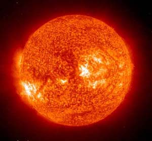图为美国宇航总局的SOHO人造卫星拍摄到的“太阳风暴”壮丽景色,干扰了部分飞机航线的通信但幸好未酿成事故。“太阳风暴”是太阳因能量增加向空间释放出的大量带电粒子流形成的高速粒子流。由于太阳风暴中的气团主要内容是带电等离子体,并以每小时150万到300万公里的速度闯入太空,因此,它会对地球的空间环境产生巨大的冲击。太阳风暴爆发时,将影响通讯、威胁卫星、破坏臭氧层。科学家形象地把太阳风暴比喻为太阳打“喷嚏”。太阳的活动对地球至关重要,因而太阳一打“喷嚏”,地球往往会发“高烧”。