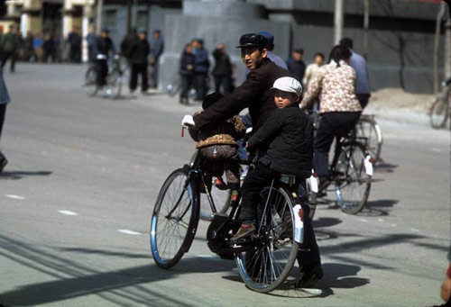 图片说明:唐山街上,一个男人用自行车带着孩子。
