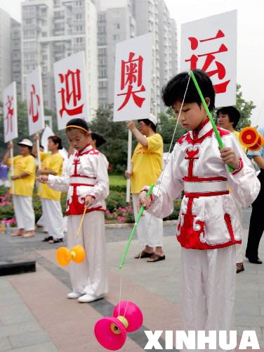8月8日,北京学生孙雨(右)在东四奥林匹克社区表演抖空竹。
