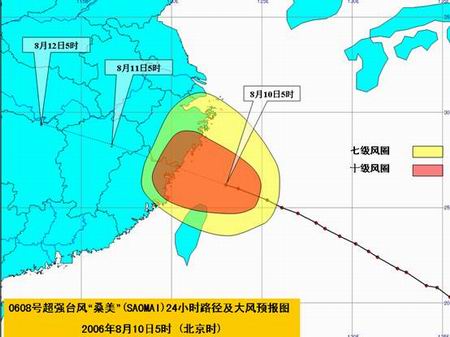 中央气象台8月10日早晨六点钟发布超强台风紧急警报:今年第8号强台风“桑美”(SAOMAI)已于昨天傍晚加强为超强台风,早晨5点钟其中心已经移到了浙江省温州市东南方大约270公里的东海南部海面上,就是北纬26.2度、东经123.0度,中心附近最大风力有17级(60米/秒)。
