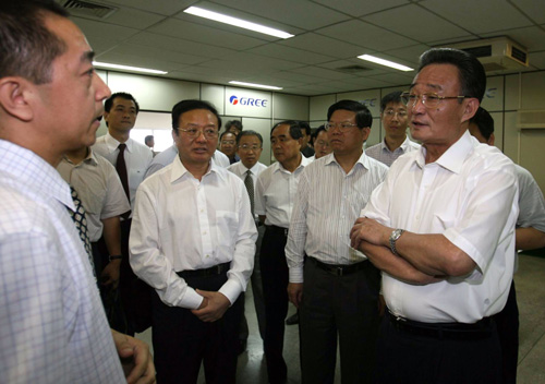 9月3日,正在巴西进行正式友好访问的全国人大常委会委员长吴邦国考察马瑙斯自由贸易区工业区中资企业,亲切看望在这里工作和生活的员工。这是吴邦国在格力电器(巴西)有限公司视察。
