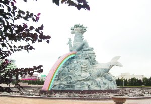 同时,园中还立有七十二块刻有历代书法家书写的各种字体的“水”字石碑,象征着天津七十二沽。此外,占地约961.6平方米的主雕塑“跨越”取材于“鲤鱼跳龙门”的传说,以房山石为材料,雕刻了一条高达20.01米、重达5180吨的巨型石雕龙,寓意天津以水为脉、跨越式发展的美好前景。