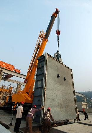 9月15日,施工人员在吊装三峡工程南线船闸输水廊道检修门。