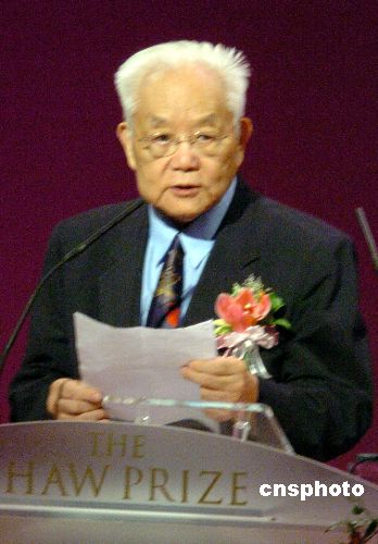 | 邵逸夫奖数学科学奖得主中国科学院87岁的吴文俊教授﹐2006年9月12日晚在香港邵逸夫奖颁奖大会上演讲。这个奖项是为表彰他对一新兴学科的贡献和数学的机器证明法 |