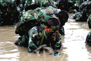 10月26日5时,“魔鬼训练”第3阶段的紧急集合哨音骤然响起。刚刚结束了16小时扛圆木训练和夜间意志训练、进入梦乡不到3个小时的新队员们听到教官严厉的吼声:“两分钟后集合。”队员们拼命睁开睡意蒙眬的双眼,穿衣服、打背包、背上净重21公斤的弹药箱,三步并作两步跑到集结地。