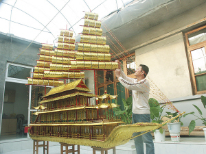 昨天下午,走进东丽区新立街西杨场村这户村民家中,一艘金碧辉煌、古香古色的巨型纸船就“闯”进眼帘。一名男青年正在大船旁做着最后的整理工作,他就是这艘巨型纸船的制作者——今年30岁的张文龙。由于这艘纸船高达2.3米,张文龙只能踩着自制的高凳,才能摸到纸船桅杆的顶部。船的主体由三层船舱和三根主桅杆组成。船身上不仅设有凉亭,还设有多个上下船舱的楼梯。船身上设有的三层船舱,分别被分割成四、六、八间小船舱。令人惊讶的是,这些船舱的门窗全部可以开启。