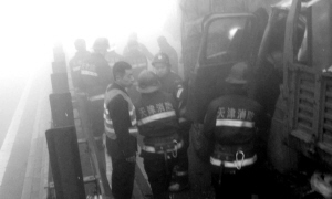 高速公路周围弥漫着很浓的雾气,甚至个别路段的能见度只有十多米。前车身撞“伤”的两辆货车挤成一团,两车中均有人被困在变形的驾驶室中,其中一辆货车还漏出大量油料,事故现场弥漫着阵阵刺鼻的油料味。