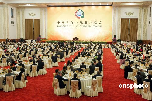 中非合作论坛北京峰会欢迎宴会十一月四日晚在北京人民大会堂举行,中国国家主席胡锦涛致祝酒辞。