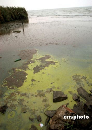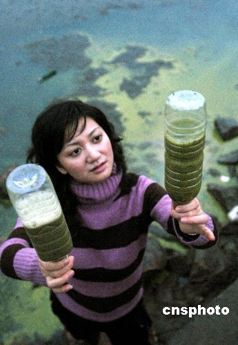 在湖州太湖流域采集的蓝藻水样。往年夏季是太湖蓝藻爆发季节,10月至次年2月蓝藻处于休眠期,但是今年,至现在太湖的蓝藻还在持续爆发,大量蓝藻已逼近湖州市位于城西、城北的两大自来水取水口,直接威胁城区数十万市民饮水。该市自来水公司已经启动紧急预案,目前尚未给饮水安全造成明显影响。据了解,这次蓝藻肆虐的直接原因是污染造成的水体富营养化,当蓝藻大量繁殖时,水中的溶解氧浓度会迅速降低,造成鱼虾、螺蛳等水生物的死亡,使水体遭受污染。从实验结果来看,蓝藻对肝、脾都有一定的影响。