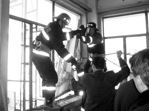 此时,几名消防队员来到5楼的窗户旁,先用绳子将广告牌捆绑起来做好保护,然后用切割工具将广告牌与铁架子的连接处割断。“使劲拽好,别让广告牌掉下去。”消防队员相互协作,终于将广告牌拽回屋内。