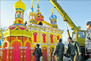 技术人员正在吊装高15米、占地200多平方米的异国风情灯组“俄罗斯大教堂”