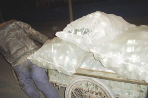 昨日下午5时许,记者赶到河东区八号路附近的一个停车场,但等待多时并没有看到暂存在此的装满医药瓶的三轮车。当记者离开行至光华桥附近时,发现一名男子费力地推着一辆三轮车向河东区方向走。靠近后发现,男子推的三轮车上装着几大包编织袋,一些编织袋有些破损,可以看到里面装的都是用过的医药瓶。