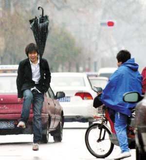 放学后,孩子们拿水洼当跨栏模仿刘翔。从昨天凌晨开始的小雨给这座天气刚刚回暖的城市增添了些许凉意。