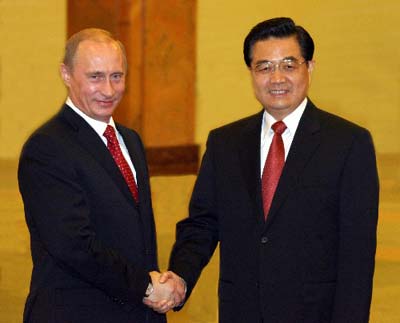 资料图片:2006年3月21日,中国国家主席胡锦涛在北京人民大会堂同俄罗斯联邦总统普京举行会谈。这是会谈前,胡锦涛主席同普京总统亲切握手。