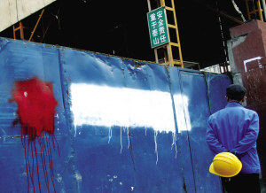 昨天,记者在苏州街地铁站东北口看到,工地围挡大门处有7个模糊不清的大字,隐约可见前两个字“中铁”和最后两个字“集团”,中间的字很难辨认。记者注意到,一张落款日期为3月25日的通知单上也涂了很多油漆。住在此处的多名工人说,这些字原来写的是“中铁十二局集团”,发生事故后,被用油漆涂了。经常在附近的公园晨练的王先生说,“这些字28日早上还都好好的。”随后,记者在另两处围挡也看到类似被涂抹的痕迹。