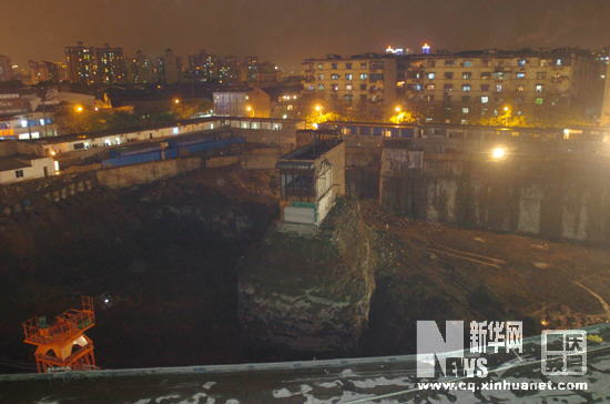 资料图片:一个被挖成10米深大坑的楼盘地基正中央,孤零零地立着一栋二层小楼。