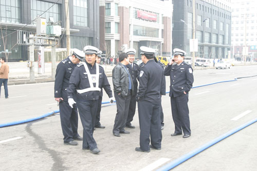 沈阳市消防支队出动了十几台消防车,进行抢险救援。正值早高峰,南五马路已经封锁交通,消防队员已围起警戒线,疏导群众。由于火势非常猛烈,抢险人员无法靠近灭火。现场救援和维持秩序的警察正将附近100米之内的车辆转移。