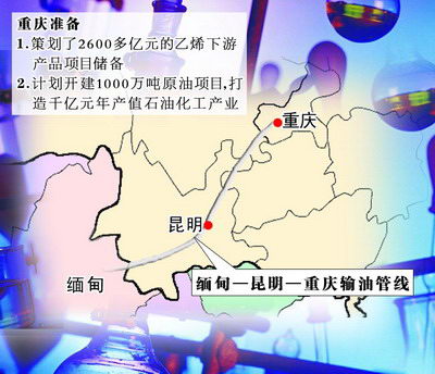 据了解,目前国内每年成品油需求量为4亿多吨,其中2亿多吨通过国外经沿海地区送往内地,1亿多吨依靠国内自产。而中缅输油管道延伸到重庆后,我市将成为中国重要的战略后方,成为石油储备的新基地。在今年初,常务副市长黄奇帆曾透露,中缅输油管道在重庆的“出口”,很可能位于长寿化工园区。