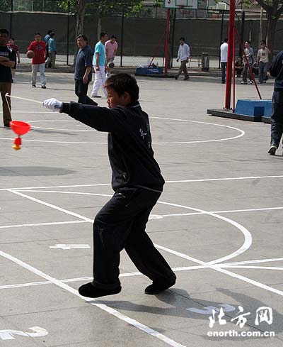 北方网消息(记者于浩):5月4日,天津市人民体育馆前广场上,一场趣味横生的运动会引吸了成百上千名市民驻足观看。十几名天津本地的抖空竹高手在广场上表演起各自的看家绝活,提、拉、抖、盘、抛、接,走、跳、绕、落、蹬,小小的空竹在表演者受手中忽高忽低、时快时慢,各种令人叹为观止的花式动作有如行云流水,连绵不断……