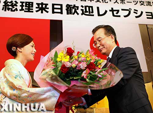 资料图:4月12日,中国国务院总理温家宝同日本首相安倍晋三在东京共同出席日中友好七团体联合举行的招待会。