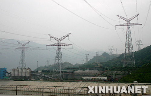 | 三峡右岸电站首台机组并网发电在即,三峡右岸电站电力外送通道全线贯通。右岸电站新发电力将主要输往华中电网和华东电网。这是三峡右岸电站550千伏输变电线路(6月4日摄) |