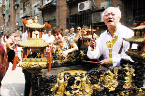 天津第一批市级非物质文化遗产名录公布之后,在市民中引起了强烈反响。近日,河西区文化部门将《非物质文化遗产展》在社区进行巡展。图为传自清代康熙年间的永音法鼓引起了市民的浓厚兴趣。