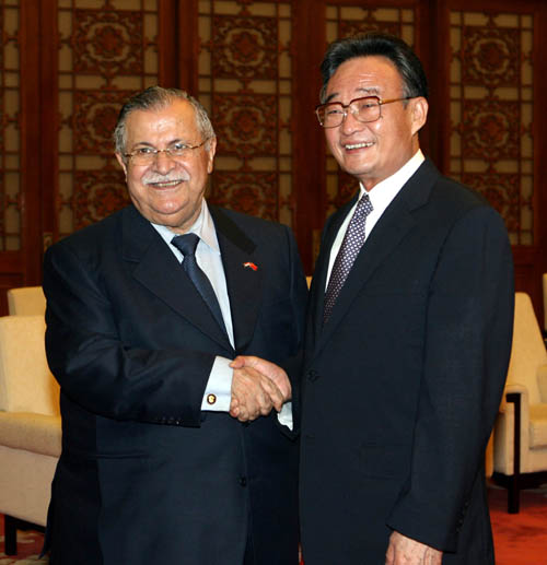 全国人大常委会委员长吴邦国22日在人民大会堂会见了伊拉克总统塔拉巴尼。