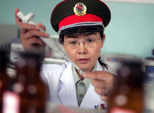 2005年8月24日,军中女博士杨蓉娅在做医学实验。北京军区总医院皮肤科主任杨蓉娅教授多年来发表医学科研论文116篇,获军队医疗科技进步奖9项。先后荣立过特等功、二等功、三等功,获全国“三八”红旗手荣誉称号,连续三届担任全国人大代表。