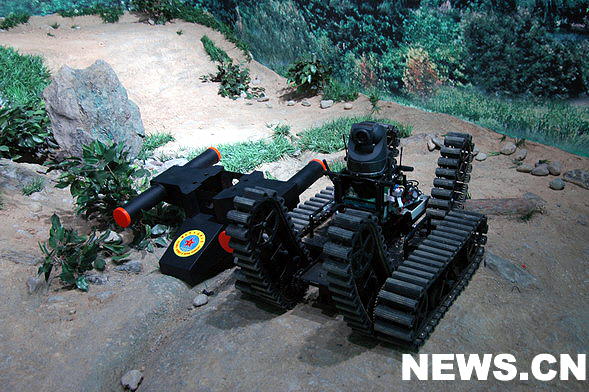 为纪念中国人民解放军80周年,由中共中央宣传部和解放军总参谋部、总政治部、总后勤部、总装备部联合举办的《我们的队伍向太阳——新中国成立以来国防和军队建设成就展》,7月16日在中国人民革命军事博物馆隆重开幕。图为展馆内展出的我军新型战场机器人系统。新华网发