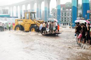 此时,重庆主城区内的多条道路已变成了河流,水深大多没过小腿,红旗河沟、新牌坊等立交桥下都已经趴了一长串的车。人民广场上的积水已开始向附近的一家超市倒灌。