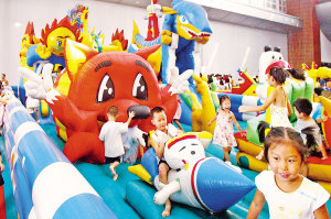 大型卡通淘气堡成为孩子们的乐园。