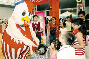 孩子们和卡通人握手。