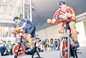年轻人正在进行器械健身体验。