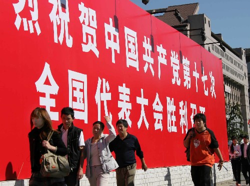 10月14日,行人从北京西单街头的喜迎十七大宣传牌前走过