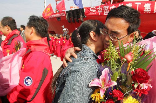 | 11月12日,一位考察队员正与亲人话别。 |
