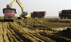 初冬的旷野浸裹着寒意,而太平镇煤炭物流园却热浪滚滚。走进园区的建设现场,红砖圈就的200多亩场地,完全成了一个施工会战的战场:挖掘机、推土机、装载机、轧路机、翻斗运输车等工程机械,来来往往,隆隆作响;工地四周,彩旗猎猎,场内白灰土、三合土堆得老高,入口处悬挂的鲜红布标上,“大干45天,早日实现运营”的标语格外显眼;园区西侧,高高路基上的万黄铁路的1050米卸煤专线,一直静悄悄地延伸到料场的西北角……轰轰烈烈的施工场面。