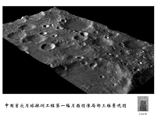 这是国家航天局公布的中国首次月球探测工程第一幅月面图像局部三维景观图。国家航天局发言人9日表示,目前嫦娥一号卫星探测仪器均已开机工作,并获得了探测数据。目前正在进行处理,已取得部分科学成果。同日,国家航天局再次公布数张根据嫦娥一号传回数据制作完成的月图。