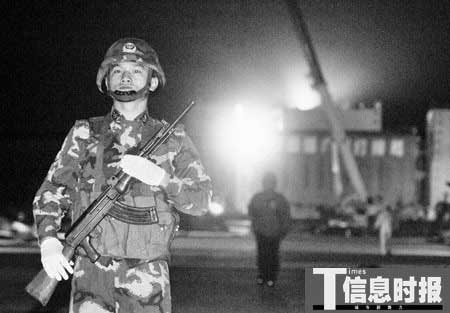| 持枪武警晚上在“南海I号”上岸码头执行警戒。 |