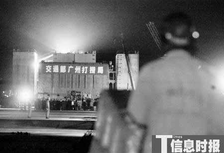 | 昨晚9时多,在武警的守护下,装有“南海I号”的沉箱开始向码头拖移,但只前进10米就因风浪太大被迫停止。 |