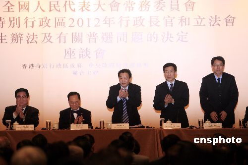 | 十二月二十九日,全国人大常委会副秘书长乔晓阳(右3)、全国人大常委会法制工作委员会副主任李飞(右2)和国务院港澳事务办公室副主任张晓明(右1),专程来港出席座谈会,说明全国人大常委会就香港特别行政区2012年行政长官和立法会产生办法及有关普选的问题的决定。 |