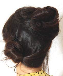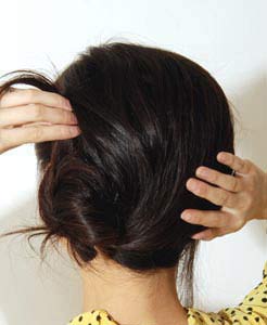 步骤4、将上面一个区的头发放下,顺着发髻的方向缠绕,并卡住。